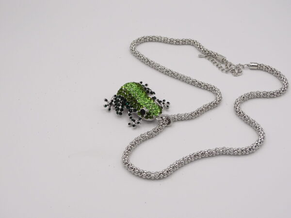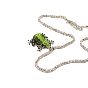Lange zilverkleurige verstelbare ketting met groene strass kikker