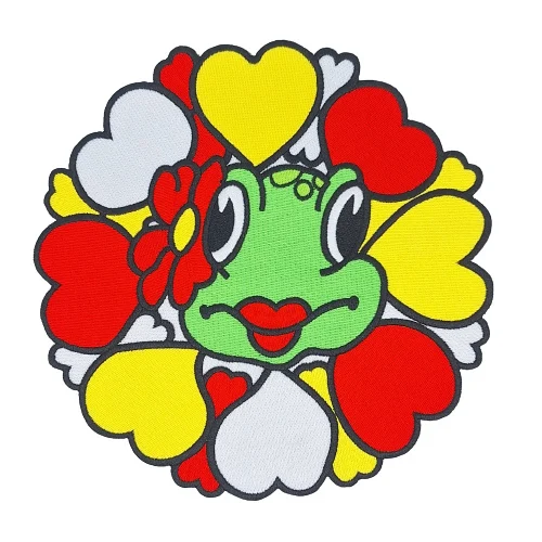 Rug embleem kikker rondje met hartjes groot aantal