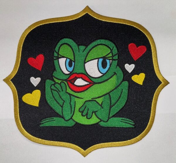 / Rug embleem kikker zwart met gouddraad met hartjes